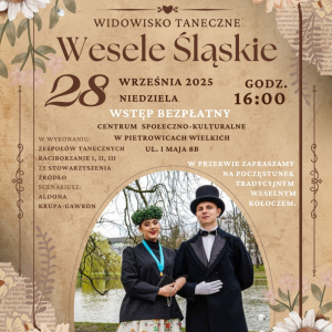 Już 28 września 2025 r. (niedziela) o godz. 16:00 w Centrum Społeczno-Kulturalnym w Pietrowicach Wielkich odbędzie się „Wesele Śląskie” – barwne przedstawienie pełne muzyki, tańca i tradycji naszego regionu.